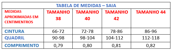 Confira nossa tabela de medidas para escolher o tamanho ideal.